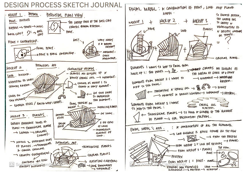 I EXTENSIVELY PLANNED MY VISION FOR THE MODELS: THE CONCEPTS AND HOW IT RELATES TO THE DESIGN PRINCIPLE AND ELEMENTS PRIOR TO STARTING WITH THE MOCKUP MODELS. RHYTHM WAS MY DESIGN PRINCIPLE, AND POINTS, LINES, AND PLANES WERE THE ELEMENTS. THEREFORE, WE HAD TO CREATE MODELS FOR EACH ELEMENT BEFORE COMBINING TWO OR THREE OF THEM TO CREATE THE FINAL MODEL.